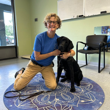 Terry started by sharing about her experience with Saunders so far. “These pups are soooo smart and of course I feel like Saunders is the brightest of all of them. Saunders came to us when he was 9 weeks old and I’d say by week 12 I could get him to jump up on a cardboard box. He’s won the hearts of everyone on our block, especially the kids. There’s one young boy who is an expert at getting Saunders to ’sit for pets.’ It’s also been wonderful to feel like together we are teaching our neighbors about the wonder of service dogs.”
